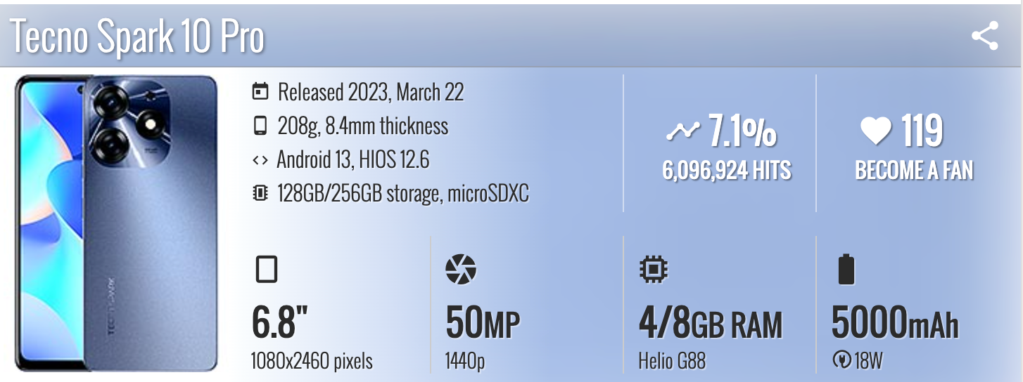 The Tecno Spark 10 Pro 8/128 offers robust performance with its 8GB RAM and 128GB storage, ensuring smooth multitasking and ample space for apps, media, and files. Designed for efficiency, it balances power and storage to meet demanding user needs, making it a reliable choice for professionals and tech enthusiasts.